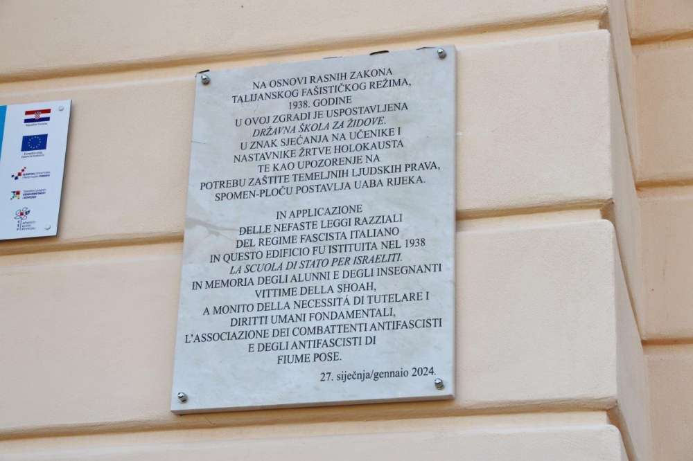 Natpis na spomen-ploči glasi „Na osnovi rasnih zakona talijanskog fašističkog režima, 1938. godine u ovoj zgradi je uspostavljena Državna škola za Židove. U znak sjećanja na učenike i nastavnike žrtve Holokausta kao upozorenje na potrebu zaštite temeljnih ljudskih prava, spomen-ploču postavlja UABA Rijeka“.