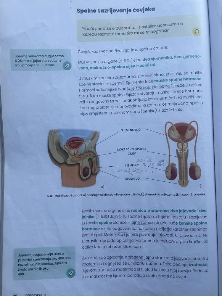 U udžbeniku iz prirode u šestom razredu koji je izdala Školska knjiga, a autori su jedan muškarac i šest žena, ženske spolne organe čine jajnici, jajovodi, maternica i rodnica, dok muške spolne organe čine dva sjemenika, dva sjemeno-voda, mokraćno-spolna cijev i spolni ud ili penis. Pri tome je za spolni ud u radnoj bilježnici izričito navedeno da se radi o vanjskom organu muškog spolnog sustava. Na slici 5.13. na stranici 79 udžbenika gdje su nacrtani ženski spolni organi na mjestu vulve je praznina. Vulva je izbrisana iz gradiva i negira se ne samo da je dio ženskog spolnog sustava i vanjski ženski spolni organ već je i vizualno izbrisana. Riječ vagina se također ne spominje. Mogu samo zamisliti kako se osjećaju ustrašene djevojčice gledajući dvije slike “muške piše” u svoj svojoj veličanstvenosti, dok se pitaju “a gdje je moja piša?”.