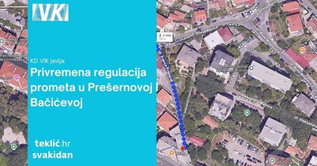 Od 19. do 22. studenog, od 9 do 15 sati, zatvaraju se Prešernova i dio Bačićeve ulice zbog radova na vodovodnoj mreži. Ruđera Boškovića privremeno mijenja smjer.