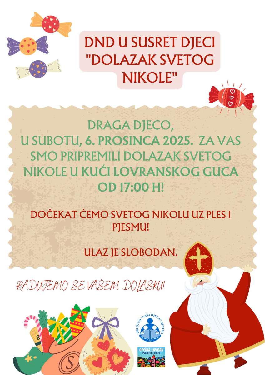 Društvo "Naša djeca" Opatija - ogranak Lovran poziva svu djecu i roditelje na tradicionalni doček Svetog Nikole koji će se održati u subotu, 6. prosinca 2025. godine u 17 sati u Kući lovranskog guca.