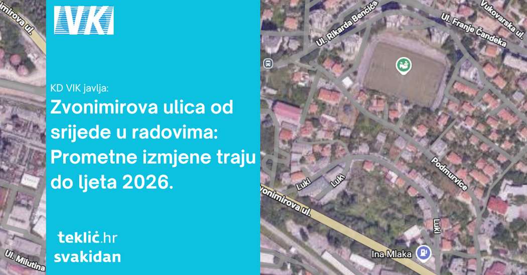 Od 19. studenog počinju opsežni radovi na vodno-komunalnoj infrastrukturi u Zvonimirovoj ulici. Promet se sužava na jedan trаk, radovi traju do srpnja 2026.